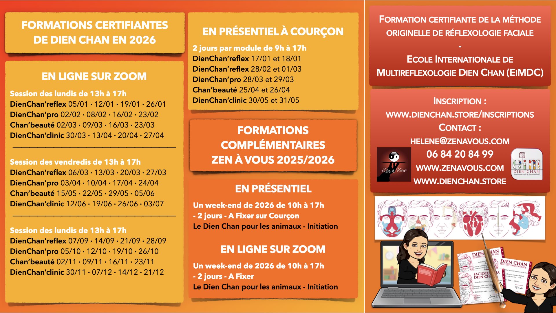 La formation complète en Dien Chan se déroule en 4 modules thérapeutiques à suivre dans l’ordre et 1 module d’esthétique thérapeutique (à suivre quand vous voulez après le DienChan’reflex) :